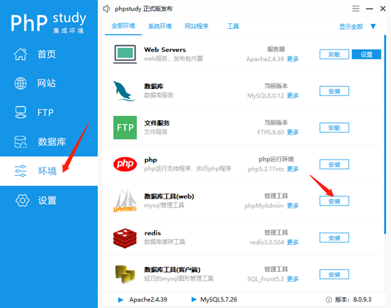 配置phpmyadmin环境,点击环境,安装phpmyadmin(数据库工具)