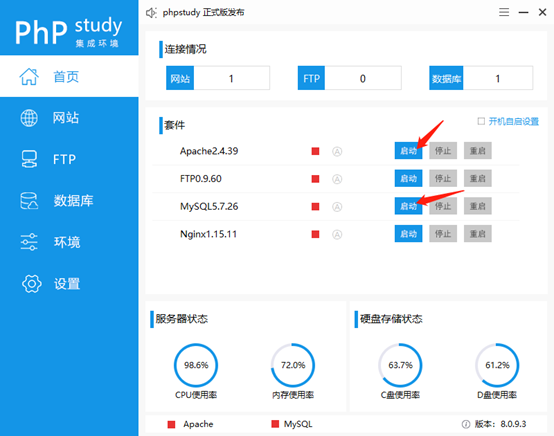 进入到phpstudy的控制台,这里不怎么需要配置环境,将我们要用到的apache,mysql启动即可